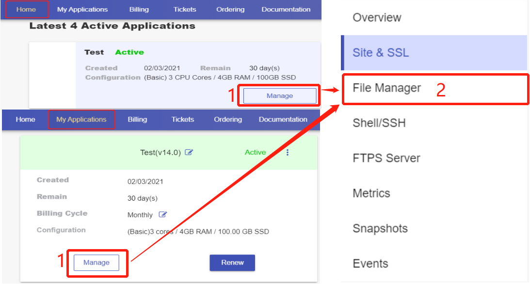 Go to the File Manager page by clicking the "Manage" button on the Home page or the My Applications page.