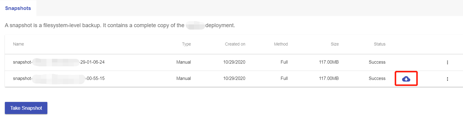 Click the "Manage" button on the Home page or the My Applications pgae, followed by the “Snapshots” tab. You will be shown a list of backup files. A “TAKE SNAPSHOT” button on the buttom allows you to manually back up your data, which will be a system-level backup.