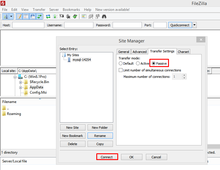 Open the Filezilla client and enter the FTP Server information, then click "connect".