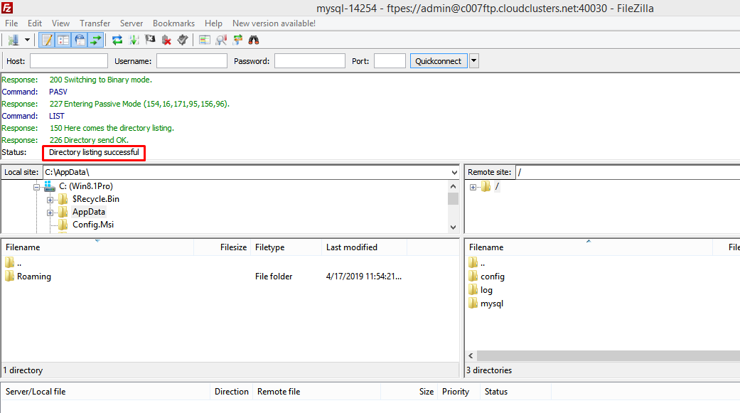 You've connected to the FTP server if you see the the folder list and "Directory listing successful" message.